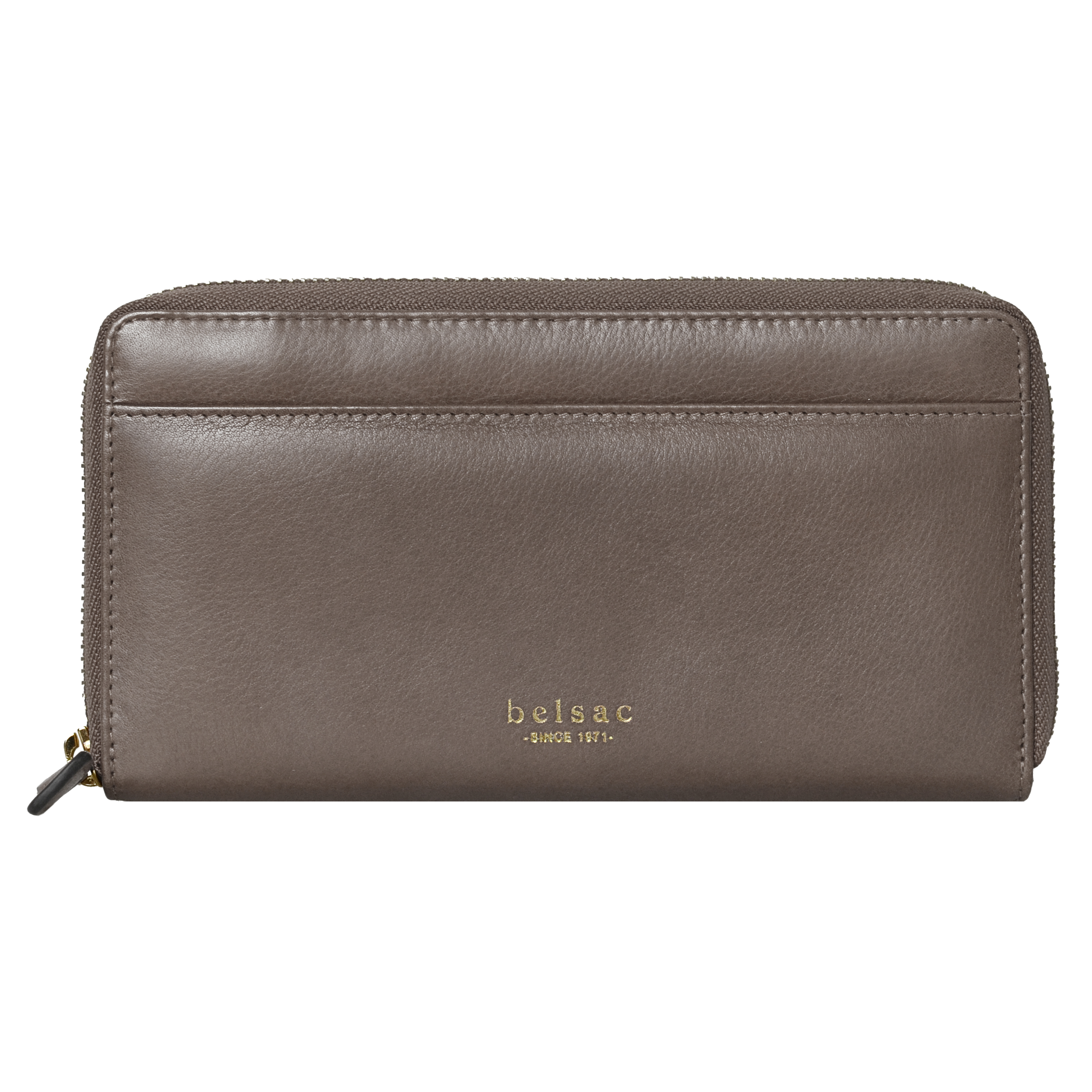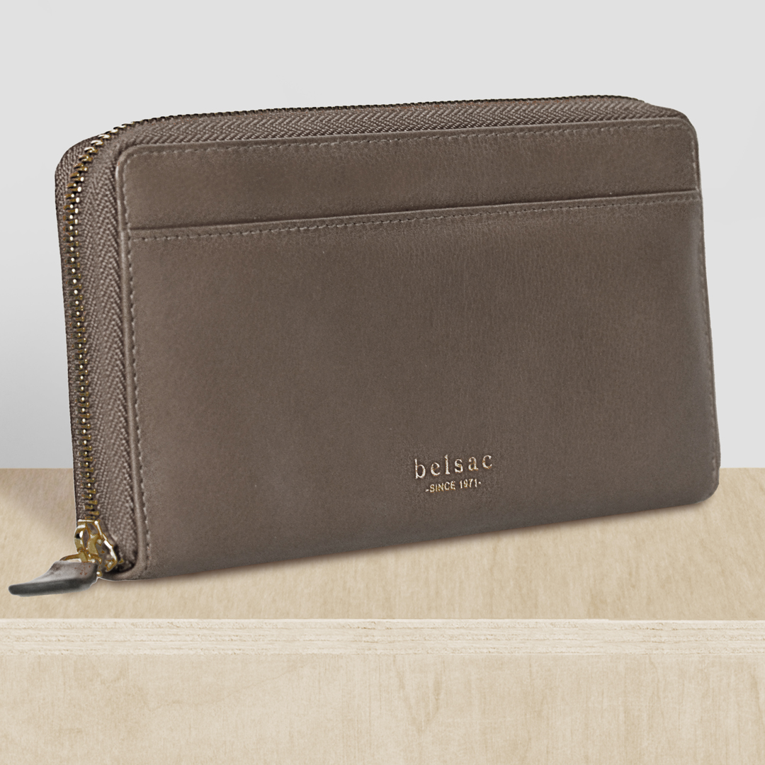Belsac stor pung i taupe mat skind med lynlåsrum til kort og kontanter samt et udvendigt rum